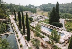 Il faut ensuite emprunter l’escalier monumental construit lors de la rénovation, pour parvenir jusqu’au cloître, désormais couvert d’une magnifique charpente en bois, qui fait office de lieu de vie où l’on partage un café, un tea time ou un verre en fin de journée. Le Feuillée, nom donné à la table gastronomique en hommage à Louis Feuillée, botaniste de Louis XIV, qui a écrit au couvent deux traités de botanique, n’est qu’à quelques