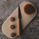 Nous mettons à l’honneur les noix avec une tarte revisitée dont la taille varie en fonction du nombre de convives. Sur une base de pâte sablée classique, plusieurs strates se superposent. Au fond, on a un flan sans œufs, surmonté de noix torréfiées enrobées de caramel au beurre salé, puis une réduction de pommes à la texture de gel, rappelant un bonbon acidulé. Le tout est surmonté d’une nougatine croquante à base de noix, d’amandes et de grué de cacao, ajoutant une subtile amertume et une belle coloration à la cuisson. Les bonbons de chocolat herbacés et boisés qui accompagnent la tarte renferment une ganache infusée aux herbes de saison (sapin, thym, sarriette, coriandre…). Ils sont recouverts d’un flocage chocolat et de pépites de chocolat brut offrant une belle acidité.