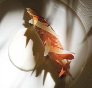 Si l’œil est d’emblée séduit, le palais n’a rien à lui envier. Le chef marseillais de 33 ans propose une carte méditerranéenne, iodée et florale, alimentée par le jardin ainsi que par des producteurs d’Île-de-France soigneusement choisis. Seules exceptions à la règle, le poisson, qui vient de Bretagne, et l’huile d’olive, évidemment importée du Sud. Les produits sont valorisés au maximum dans leur intégralité et suivent les arrivages et les saisons. « J’aime les saveurs